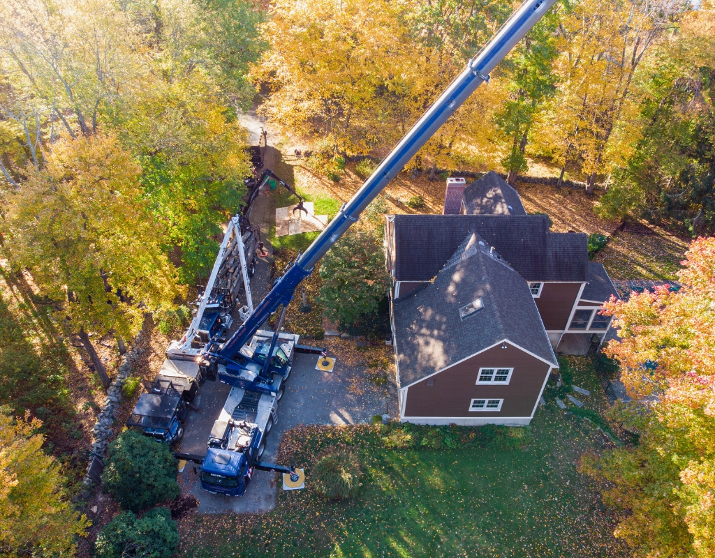 Despite initial concerns about property damage, many homeowners in Wellesley, Wayland, Weston, Dover, and Natick ultimately choose crane tree removal for compelling reasons. Cutting a tree at the base and felling it requires a large drop zone. In MetroWest’s established neighborhoods, this space simply doesn’t exist. In our area, homes sit close together, mature landscaping fills yards, and property lines are tight. Confined spaces require one of two solutions to prevent property damage or injuries:
